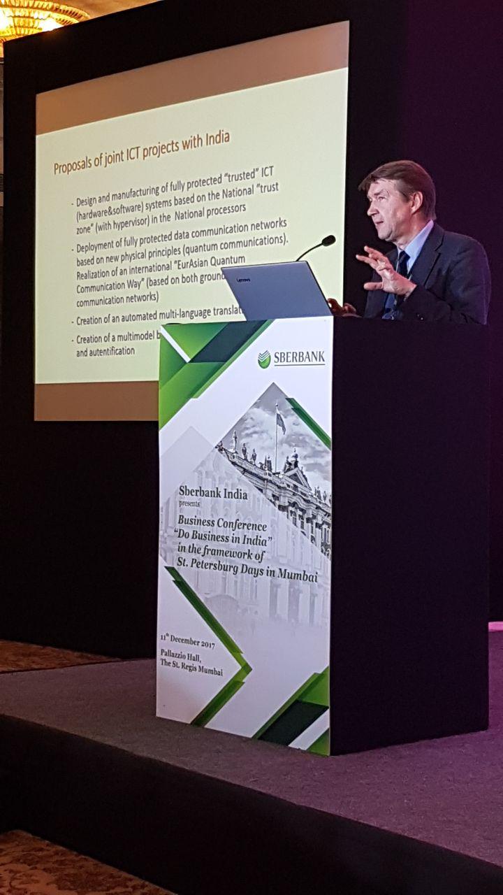 Президент НП «РУССОФТ» Валентин Макаров выступил с презентацией о ситуации в российской ИТ-индустрии и предложениями для индийских партнеров. Наибольший интерес вызвали решения для автоматизированного перевода диалектов индийских языков, решения в области кибер-безопасности, а также проект «Евразийского квантового пути», обеспечивающего защищенный трафик данных с ЮВА в Европу за счет использования квантовых коммуникаций.