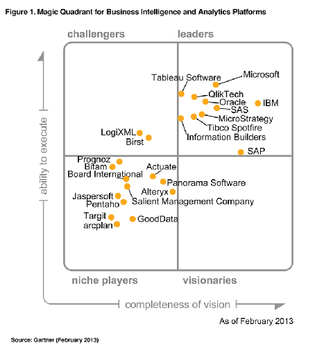 *Gartner “Magic Quadrant for Business Intelligence Platforms” by Kurt Schlegel, Rita L. Sallam, Daniel Yuen, Joao Tapadinhas. February 5, 2013.